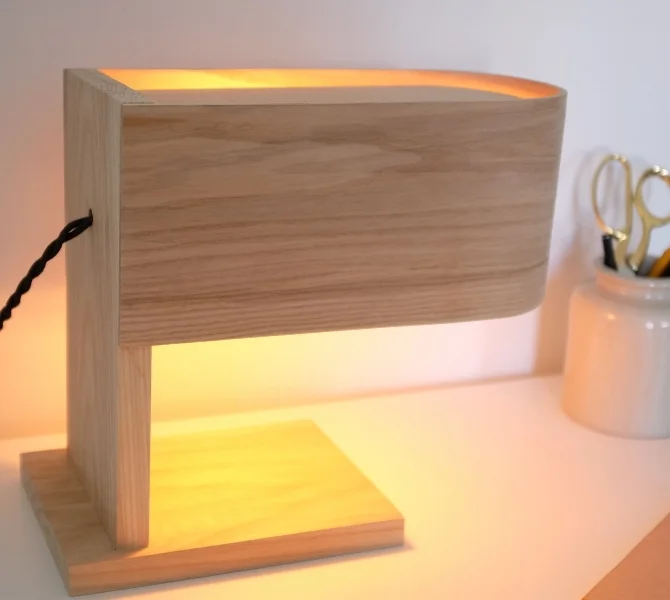 a single sweeping bend encases the light and contrasts with the angular structure of the lamp